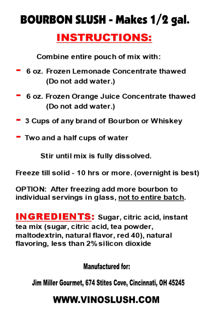 Expand your offerings to bourbon and whiskey drinkers. Our exclusive Bourbon Slush Mix helps wineries attract a broader customer base, provide unique ready-to-serve cocktail options, and drive additional sales. Available exclusively through Jim Miller Gourmet, this product offers a distinctive advantage with minimal competition.